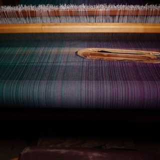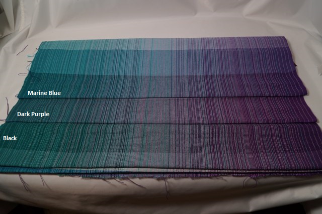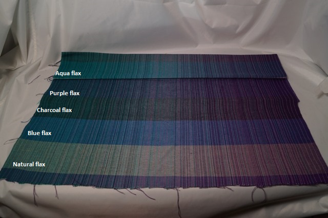 Weft options available are cotton in natural, light blue, medium blue, royal blue, marine blue, purple, dark purple, turquoise, peacock blue, lilac; merino wool in natural only; superwash merino and tussah silk in natural only; flax/tencel in blue, charcoal, aqua, and purple. Silk is available in turquoise, medium blue, light blue, grey. . Additional colours can be woven at your request.