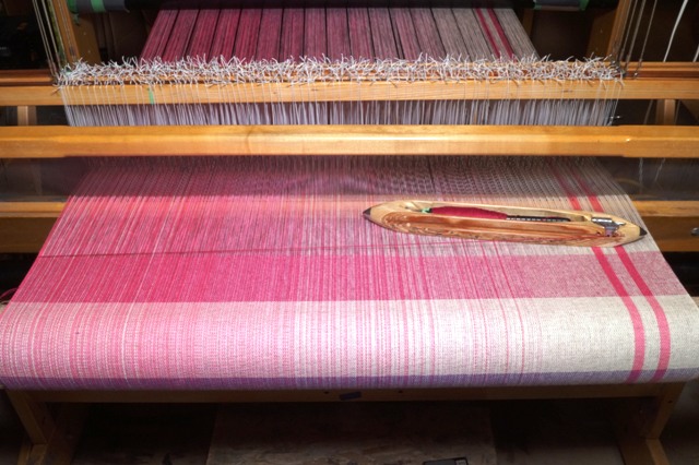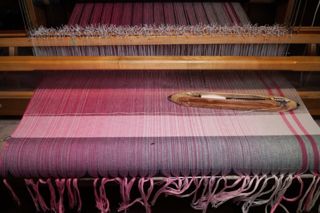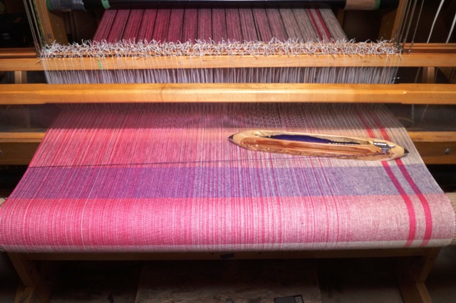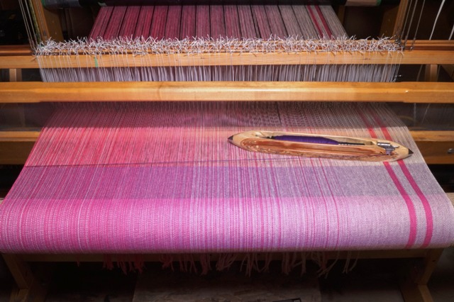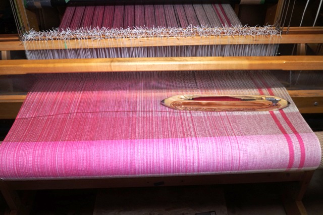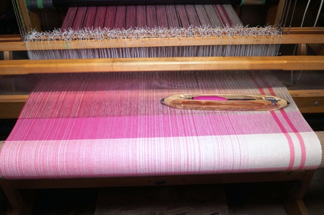 On Proof Positive Pink Nancy wove samples in cotton, available in Natural, Light pink, very light pink, dark pink, fuchsia, raspberry, magenta, or purple, in our exclusive flax blend weft in natural, fuchsia, raspberry, and purple, silk wefts are available in natural, light pink, raspberry, and purple. Merino wool and superwash merino wool and silk yarns are available in natural only.